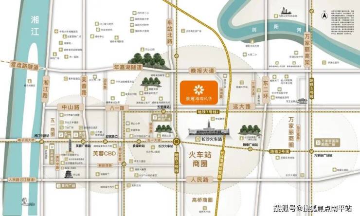 其中尤为出色的是地铁交通路网,项目往西约300米就是长沙地铁2号线/3号线长沙火车站,门口约200米即是正在建设中的7号线五里碑站,三地铁环绕。