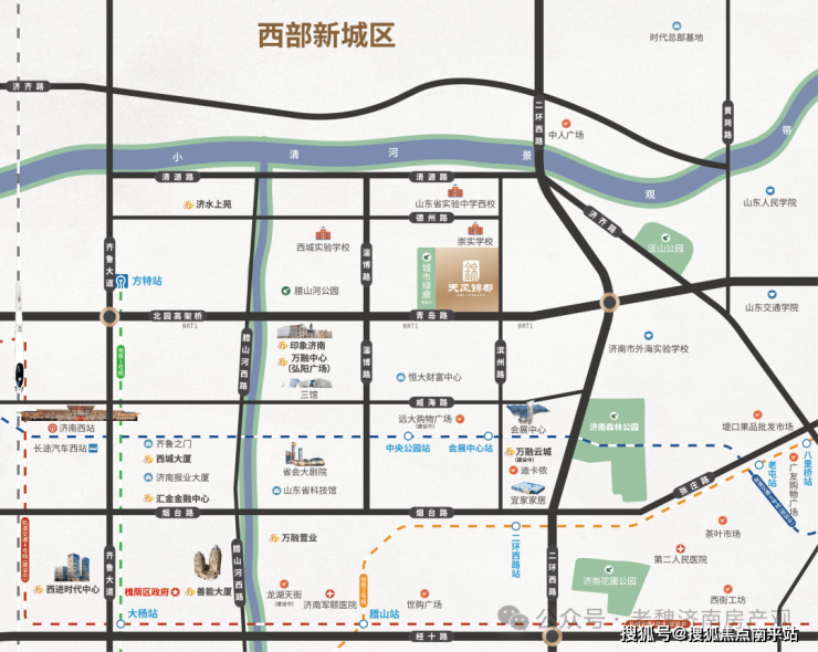 1、交通:三维立体交通环绕,地铁1号线、2号线、6号线(规划中);二环西高架、北园高架、绕城高速;济南西站。