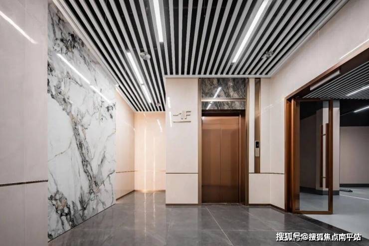 • 双奢入户大堂、格调花纹岩板、大块瓷砖铺贴、格栅吊顶+灯带