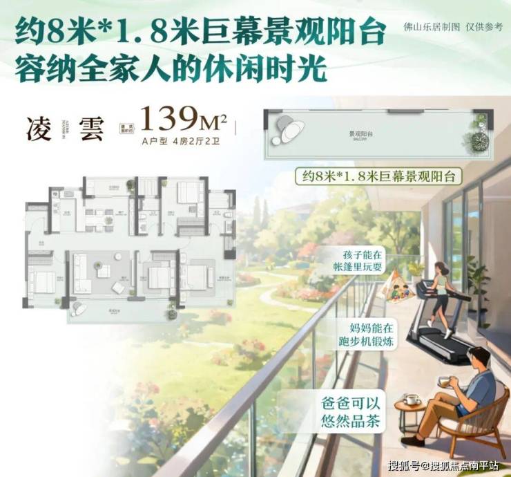 南向主阳台拓展为 约8米的双面宽巨幕景观阳台,其 进深尺度达到约1.8米,相比传统阳台进深大多只约1.2-1.5米,尺度更加奢阔,可以容纳全家人的休闲时光。