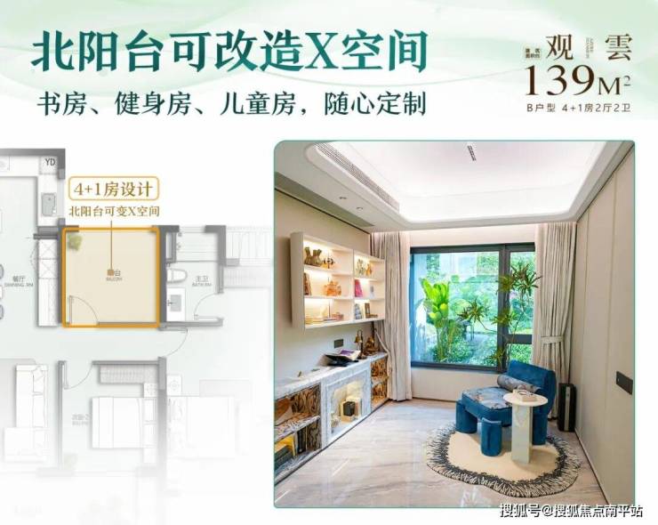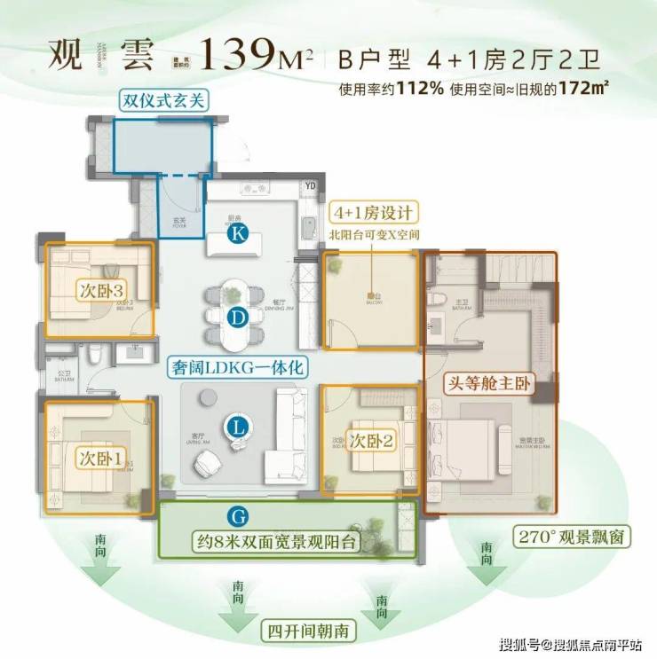 建面约139㎡的B户型, 创新性实现5房设计,还带一个灵活的X空间,使用率同样高达约112%,住出了旧规 172㎡的阔绰感。