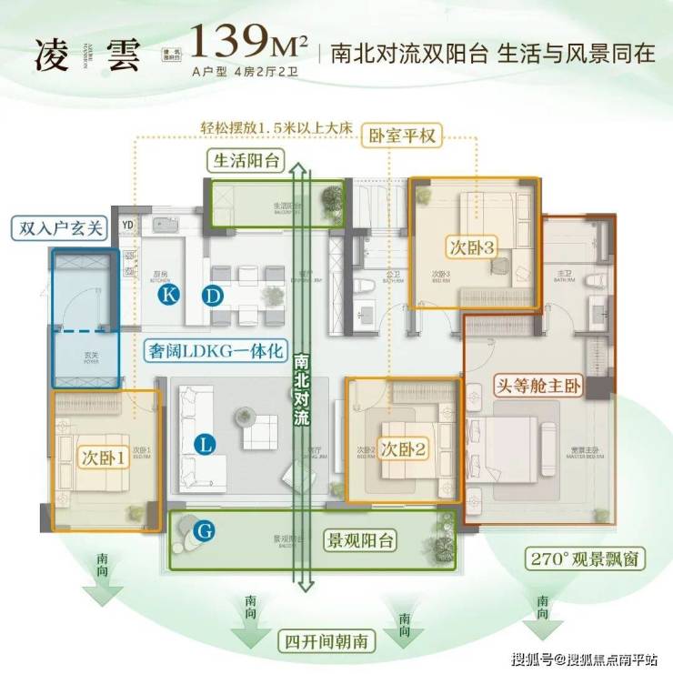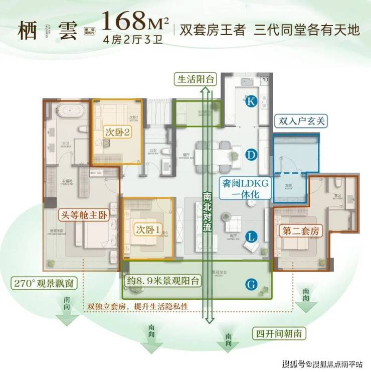 双入户玄关、南北双阳台、约8米双面宽景观阳台、四南向开间、U型开放大厨房、270°宽景主卧套房、卧室面积超11㎡起步等等, 集齐了四房改善所需的全部核心功能与吸睛亮点。