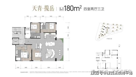 洋房,180㎡四室两厅三卫,L形边厅,客厅南向5.2米,东侧与客厅相连的开敞阳台长7.7米+宽2.4米,采光、视野较好。