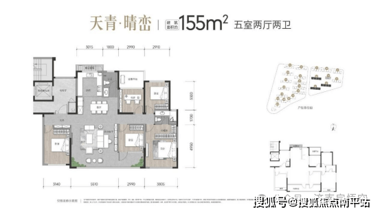 洋房,155㎡五室两厅两卫,四面宽,客厅5.5米,北侧有设备平台,如果南向老人房有个卫生间,就完美了。