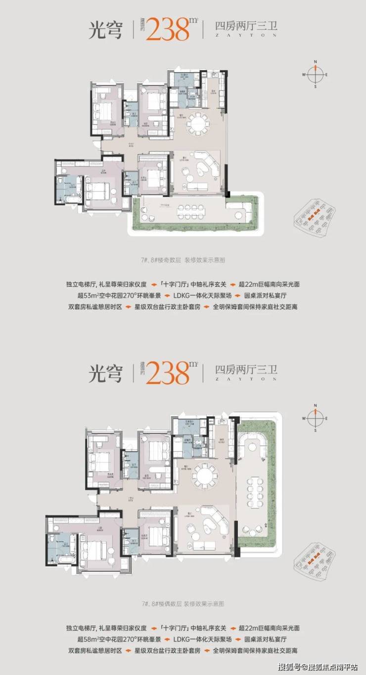 ·社交体系升级。四代宅大露台与客餐厅无缝联动, LDKG一体化超大公区,形成超级社交空间,满足家庭聚会、亲子互动、茶叙等多重场景。 动静分区,实现空间的仪式感,并 将各个功能模块尽量做到相对独立且舒适。