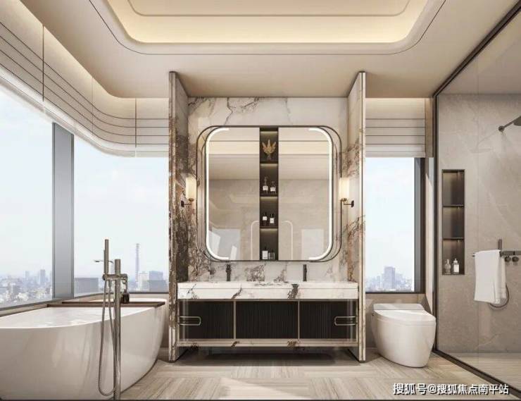 ·卧室体系升级。全户型均做到双套卧,满足「两代精英」的生活追求,四代宅 大主卧均做到双台盆卫浴+大衣帽间,部分更能做到 270°观景浴缸,充分展现高阶生活的从容气度与多元可能。