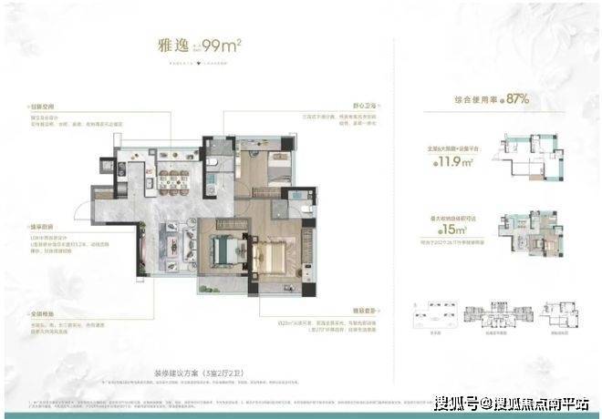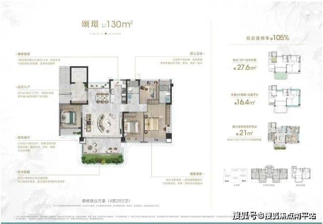 灵动空间:配置设备平台,全屋6大飘窗累计约15米,高使用率综合得房87%,相当于115平左右的使用率。