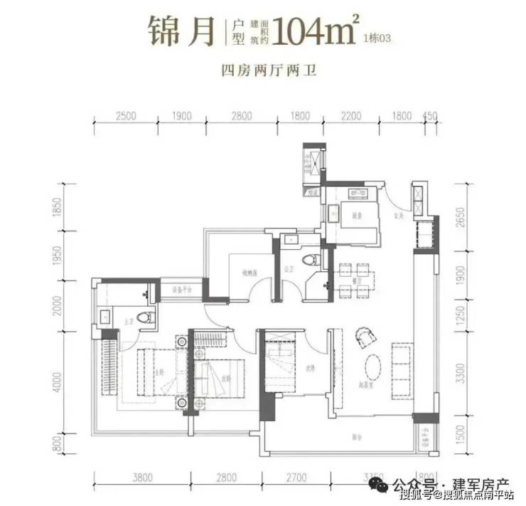 104㎡的4房2厅2卫 ,设计的是竖厅格局,客厅4.15米开间,LDKB一体化设计,预留冰箱卡槽位,四开间朝南,动静分区,主卧270°无柱转角飘窗还带1个设备平台约1.52平,分别做到了主卧20.34㎡/次卧11.2㎡/次卧7.7㎡/次卧6.75㎡(包含墙体飘窗),U型厨房烟道外置,卫生间干湿分离, 得房率约100.71%(包含赠送) ,客厅连接次卧出大阳台约11.23平,西南朝向。