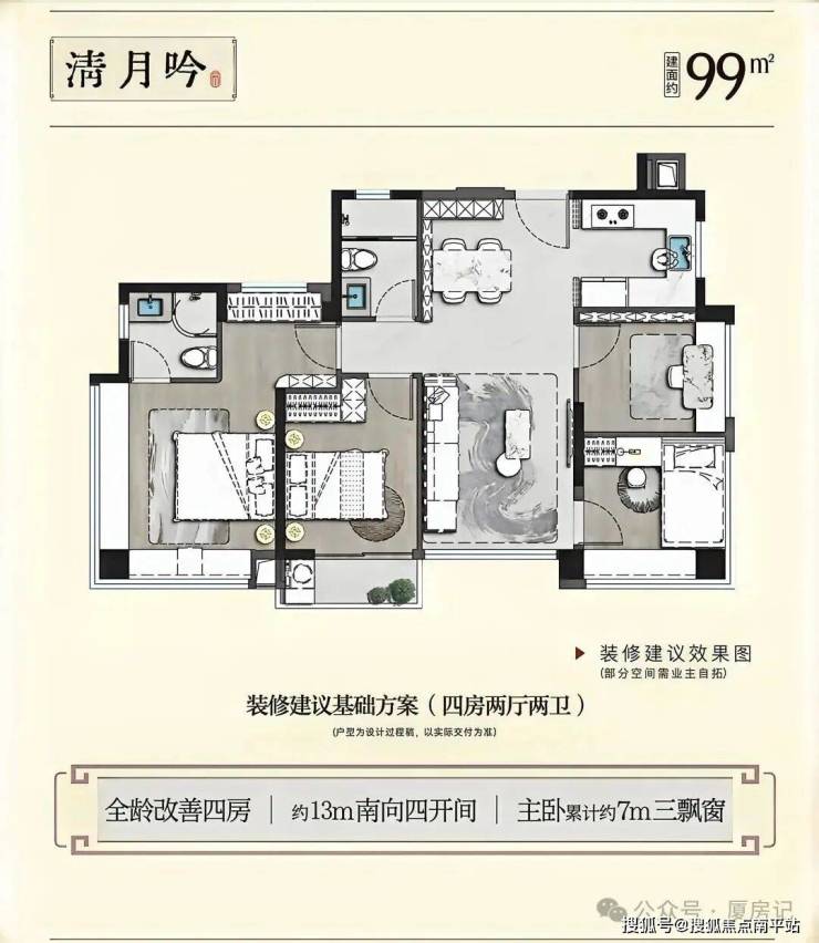 •主打99 - 192㎡四至五房的改善型户型,且首创厦门可定制交付户型;99㎡小四房,能满足二胎家庭需求;123㎡户型有14.2米南向四开间,还可定制成三房大通厅;136㎡作为主力户型可灵活调整为四房或五房;192㎡奢华大宅则面向高端客群,居住尺度优越;