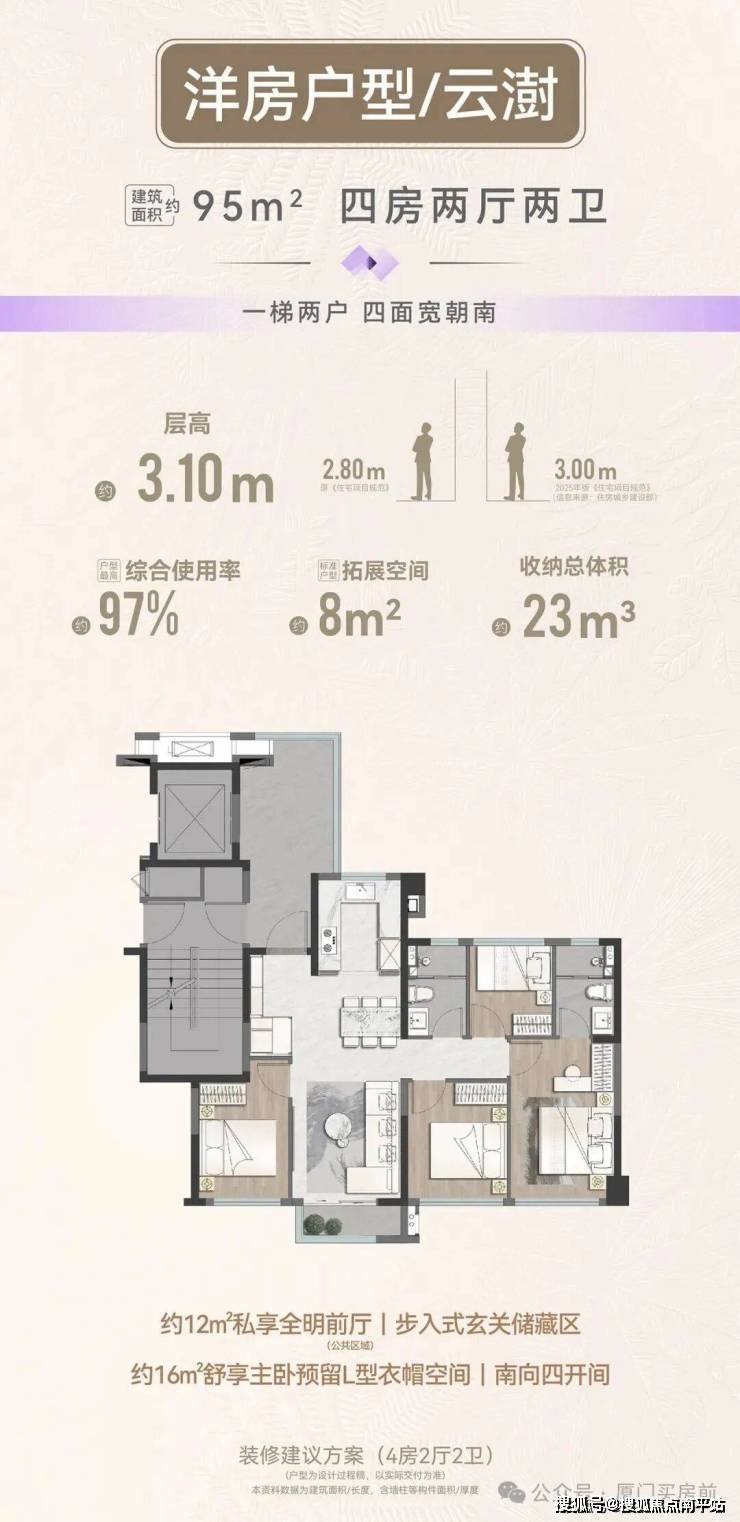 4. 95-112㎡洋房(得房率97%-98%):优点是一梯两户、私梯厅、层高3.1m,舒适度强;缺点是总价高于高层,预算门槛提升