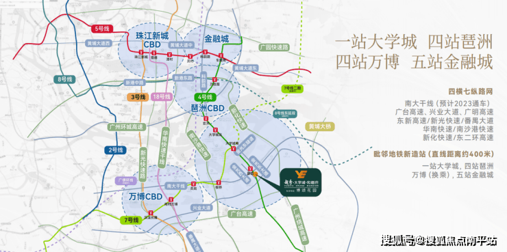 周边有13所高校,从这里出发至万博、琶洲、金融城都非常方便,几大黄金交通线路的开通,使得项目完美实现一步繁华,而且也自带11万方公园,实现了一半公园一半城的社区。