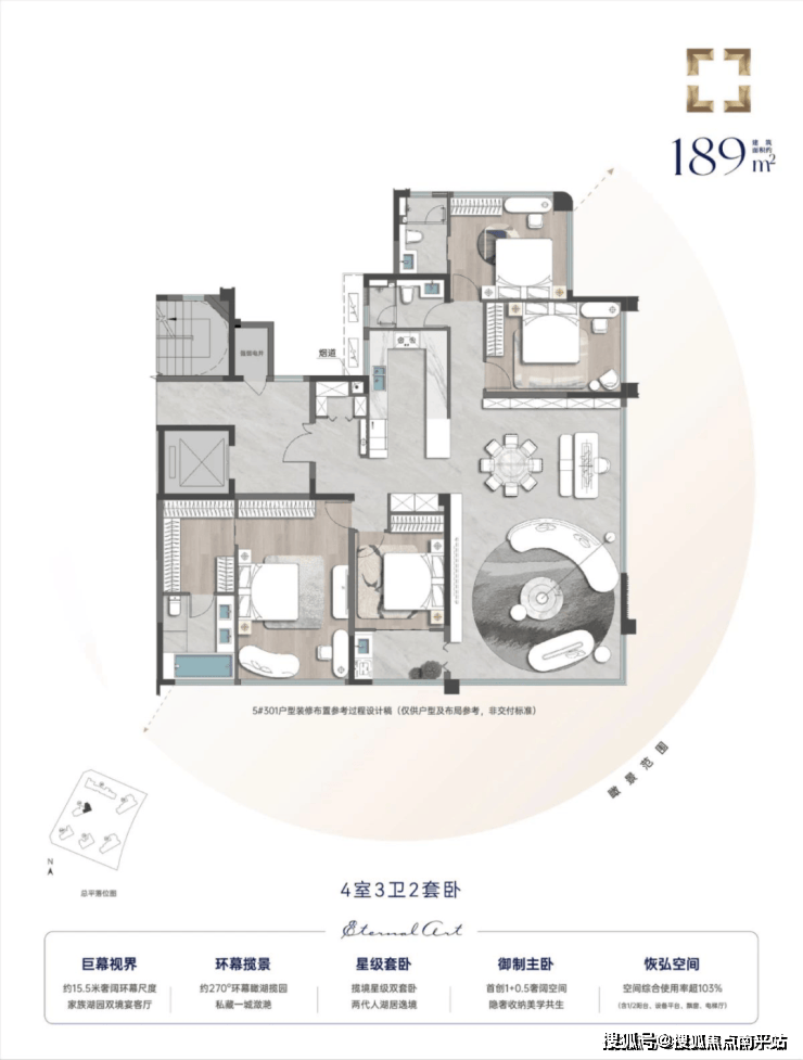 在户型设计方面,该户型空间综合使用率超103%(含1/2阳台、设备平台、飘窗、电梯厅),更是给莆田新贵带来了别样的震撼。而且,在家就能享受约270°环幕瞰湖揽园景观视野。