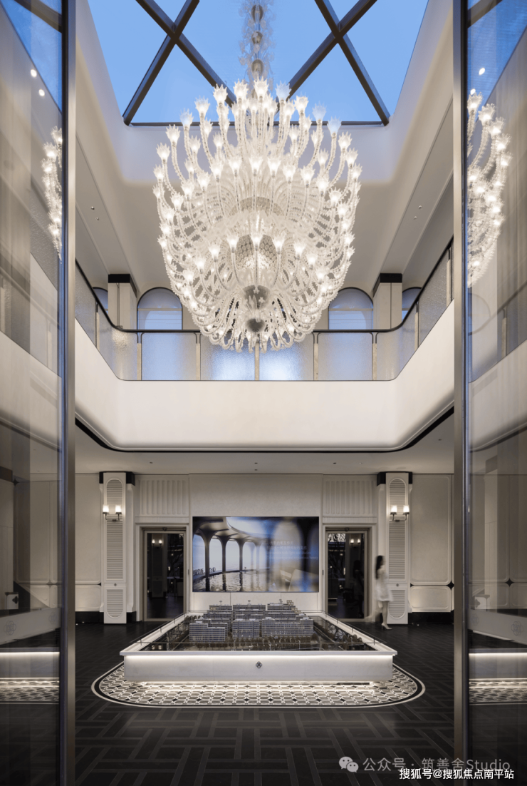 璀璨垂挂的水晶吊灯,宛如一朵经过精心拆解的海棠花,自中心向外绽放出优雅弧线,与空间内无处不在的曲线艺术相映成趣,把城市记忆转化为光学符号的巧妙构思,使功能性的沙盘展示区升华为一处引人入胜的沉浸式体验剧场。