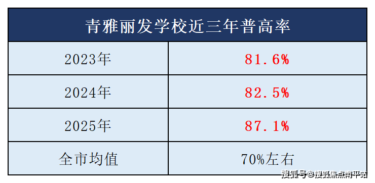 青雅丽发学校,2023年普高率81.6%,2024年82.5%,均超全市均值。