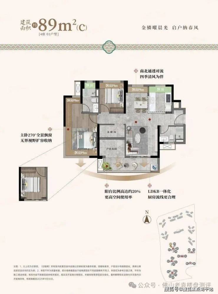 89㎡ 三房两厅两卫:刚需主力,分竖厅动静分区、南北对流两个版本,四开间朝南,双面宽阳台,主卧带 270° 转角飘窗,全飘窗可打通拓展,空间灵活度拉满