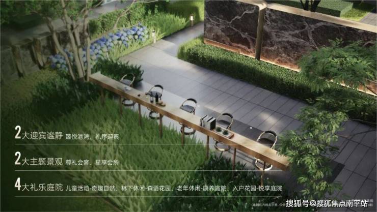 |“臻享森境”景观会客厅将自然之美与精致工艺融为一体,打造景观会客厅、艺术水景、户外吧台、阳光草坪等静谧空间。