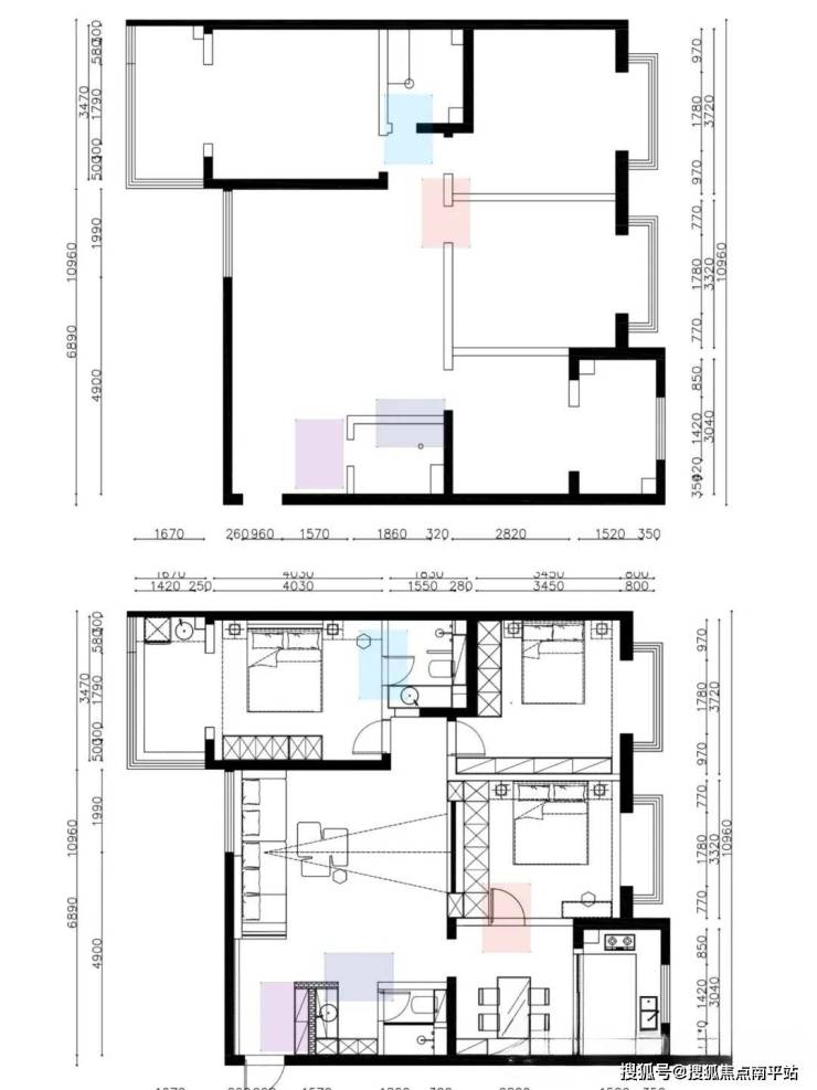 ❸ 粉色部分:将原次卧的门改至餐厅区域作为爱早起下厨做饭的老人房,保证了电视墙完整,也不影响不同人群的作息;