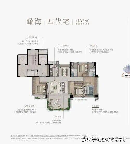 132㎡墅级四房:四代宅标杆户型,综合使用率达 107%, 3.1米层高(远超常规2.9米), 15.9米南向巨幅面宽搭配 22.9㎡空中露台,LDKG一体化设计串联生活场景,空间堪比180㎡大平层。