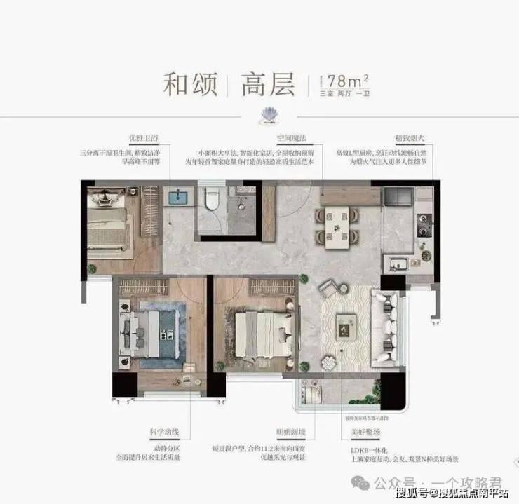78㎡精致三房:全朝南户型,独创“3+1”可变空间,北向阳台可改造为宠物SPA间或微型花园,小户型也有大灵活。