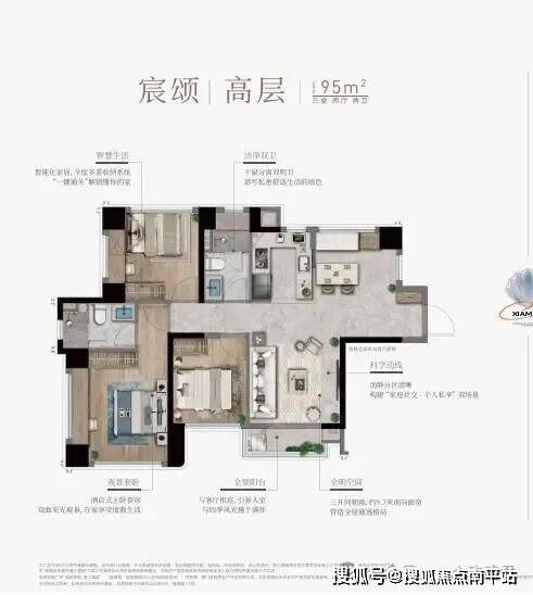 95㎡高层边套三房两卫尽显奢阔,综合使用率高达 87%(较近年次新品高约 10%), 赠送7 大飘窗 + 设备平台约11.7㎡额外空间, 16.1立方米收纳量(可放约 268 个 24 寸行李箱)与 9.7 米南向三开间,让它成为高层优质户型。