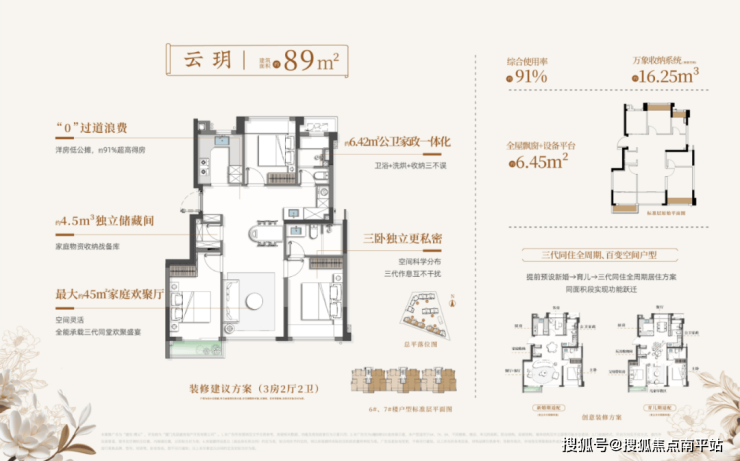 得益于建筑新规与洋房产品低公摊特性,建发璞云得房率约90%,其中89㎡户型实用面积高达约81㎡,堪比市面上110㎡高层产品。换算成经济账更显而易见:同样是89㎡户型,璞云实际可使用面积约81㎡(使用率约91%),而市面上多数项目同等面积户型使用率通常仅约85%,实际得房约75㎡,前后相差约6㎡。以周边二手房约5万元/㎡估算,相当于为业主省下约30万元购房款。