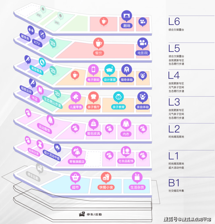 规划7大特色商业空间,时尚潮流高地、自我更新专区、综合文娱露台、元气亲子空间、社交烟火市集、超大活动中庭、生态爬山步道。