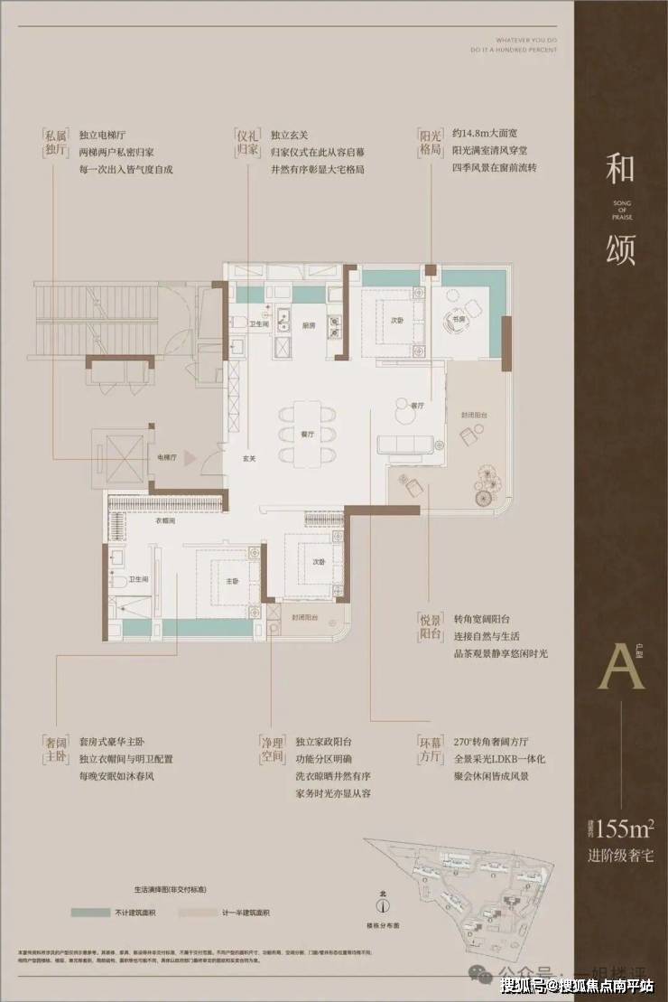 先来看A户型建面约155平四房,分布在2号楼小高层中,以及3号楼的东边。