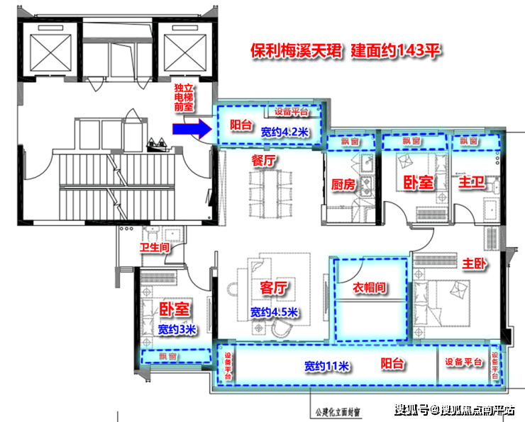 ●推出建面约143㎡爆款户型,近100%得房率;私享电梯前厅,营造出"一梯一户"的尊贵体验;四开间朝南,约14.85米大面宽;双阳台格局,南北对流;全明卫设计,无暗角阳光生活;全屋设计4个飘窗、4个设备平台,进一步增加使用面积。