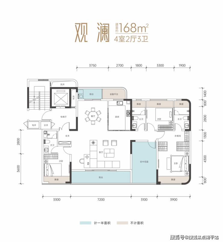 建面约168㎡:实得面积媲美其他盘190㎡,私梯入户+南向总面宽约17.5米+客厅面宽约7.2米+南向全面屏观景阳台。
