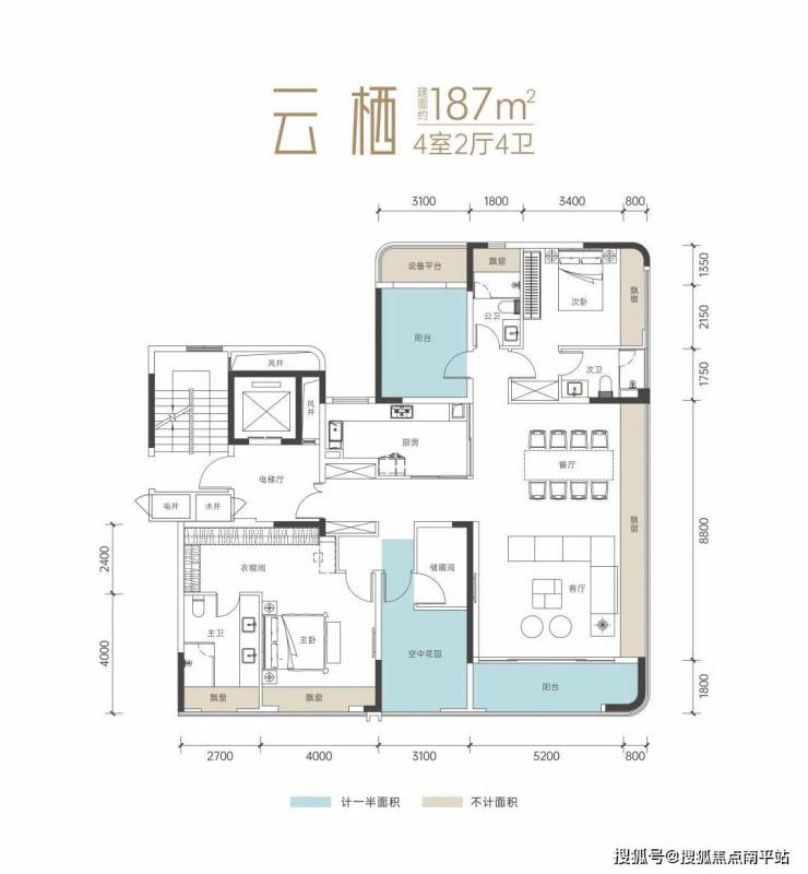 建面约187㎡:270°瞰江观景,得房率超105%,公区面积约55㎡,主卧套房面积达43㎡,中心双厨,带独立储物间。