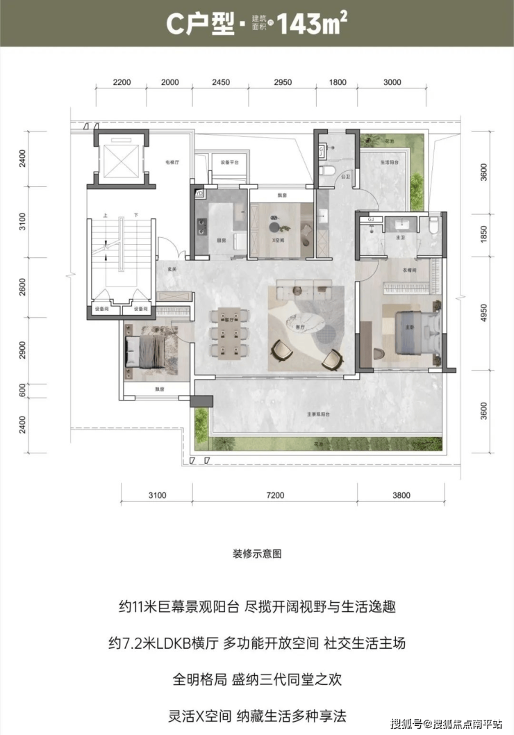 【面积区间】建筑面积约110㎡、131㎡、143㎡、195㎡