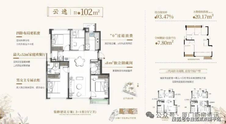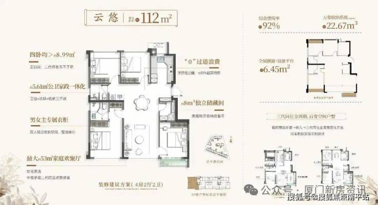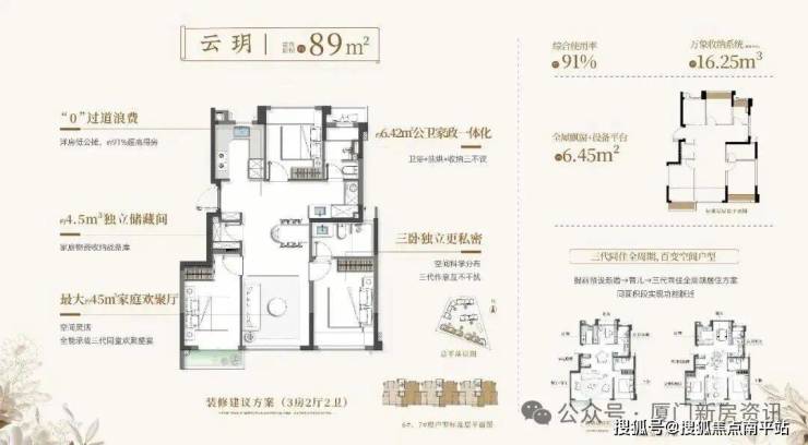 建发璞云主力户型82-113㎡。 少量70㎡三房户型,总价300多万,岛内购房低门槛。大胆的纯洋房设计+全飘窗、设备阳台赠送,让综合使用率十分惊艳:89㎡3房2卫,得房率约91%;102㎡户型得房率约93.5%;112㎡户型得房率约92% ,比起高层同等建筑面积户型,实际使用空间秒杀。 比如璞云89㎡洋房,按得房率反推,相当于市场上高层100-116平三房。