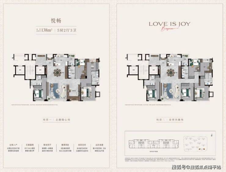 基于对当代菁英家庭改善向往,悦海棠定向研发悦己户型体系,建面约128-172㎡轻奢美学华宅,以X+1可变空间、家庭平权、超容量收纳等创新设计,由外而内,全维擢升精奢质感。