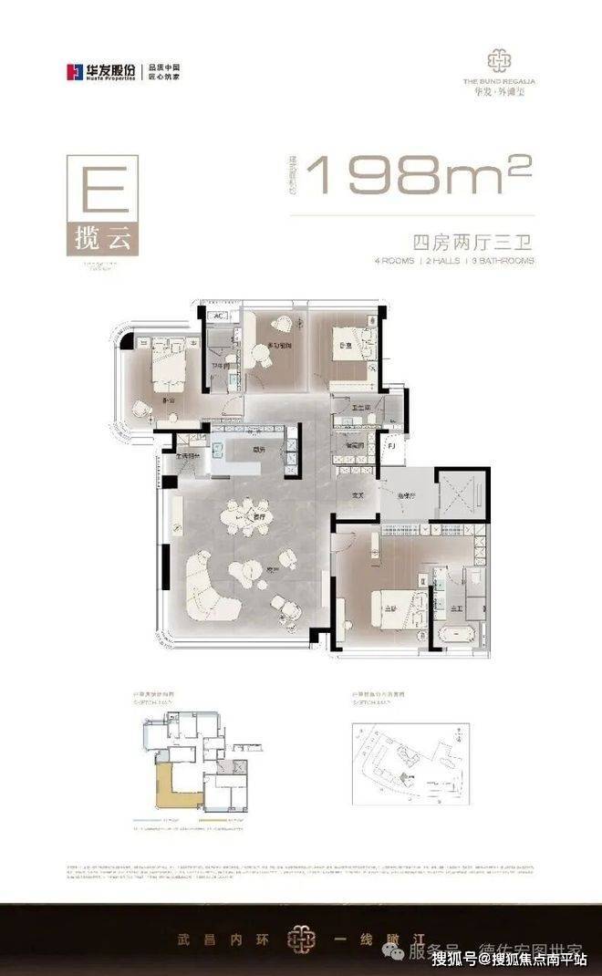 198平户型,270°环幕视野,双面大阳台,观江阳台和生活阳台。客厅、主卧双视角瞰江,全景落地窗,双主卧套间,独立家政间和储物间。
