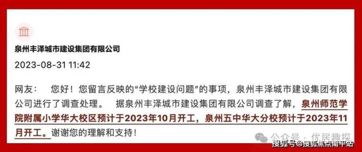 8月31日,泉州丰泽城市建设集团有限公司明确回应。师院附小华大校区预计于2023年10月开工,泉州五中华大分校预计于2023年11月开工。