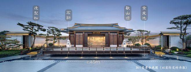 一方金龙池,设置五个雕花出水口,寓意旺财顺遂。两侧唐制景墙,与两侧对松相得益彰,恢弘大气。