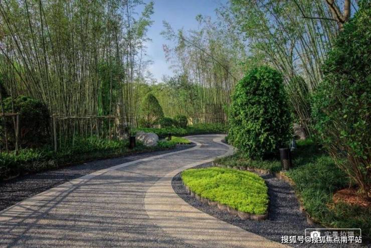 项目园林以环绕式连廊、点景亭台、曲桥竹径,将山水园境串联,归家、入户、观景、会友合而为一,一步一景,归心生活。
