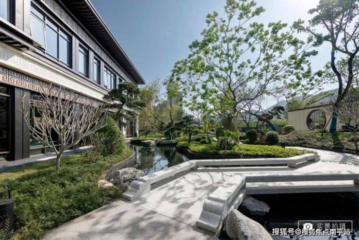 一进山水院,以叠石奇景,精巧花木为主,赋山形,观山语,呈现了一种如居山中的归家体验。二进镜水院,以水景、曲桥、角亭为主,呈现了符合中式生活特色的园林空间。