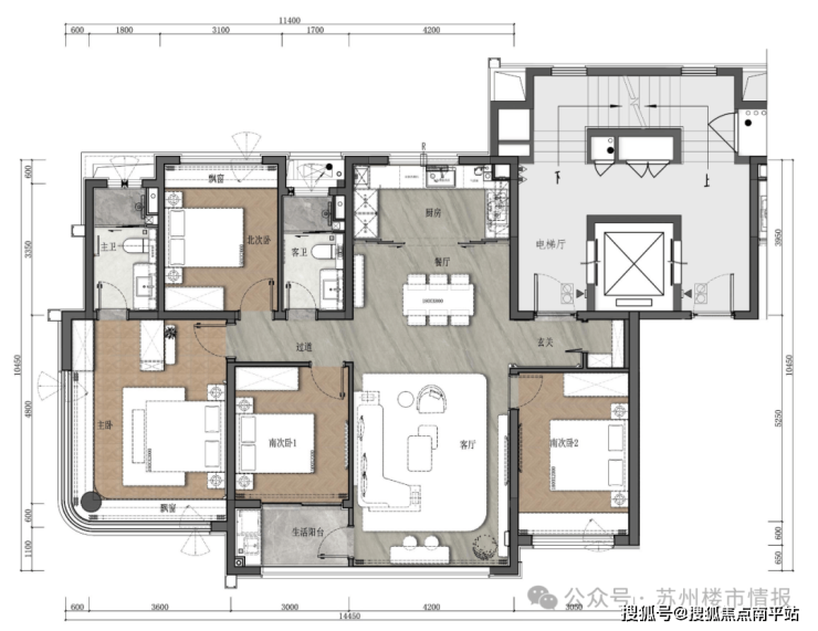 独立的入户玄关,增加了归家仪式感和收纳空间;南向约14.45米面宽,带来极致的视野和采光;长约7.2米的跑道式阳台,联通了客厅和南次卧,扩展使用功能性。