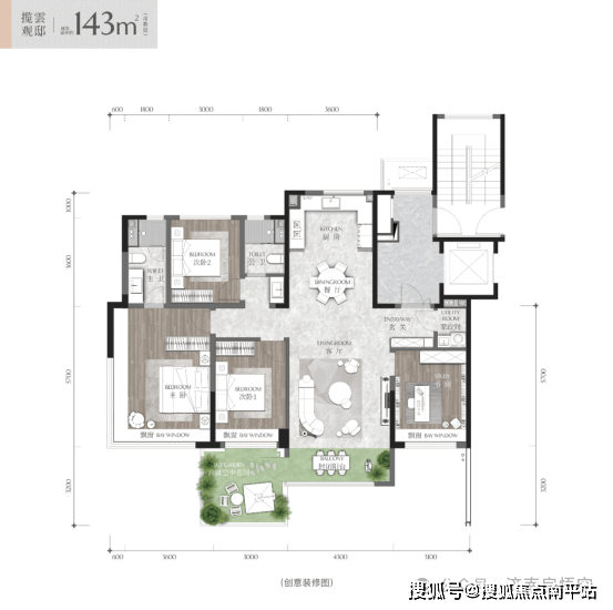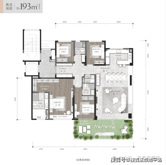 193㎡,三/四面宽,市面上L形宽厅的变种,客厅南向开间6米,东侧(奇数层)/南侧(偶数层)增加了30-36㎡的方正露台,南向露台进深约3.2米。