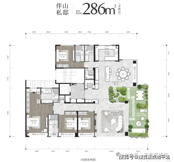 286㎡,四面宽,L形宽厅,客厅南向开间6.4米,东侧(奇数层)/南侧(偶数层)增加了30-36㎡的露台。超大餐厅,尺度堪比客厅,一个字,壕。