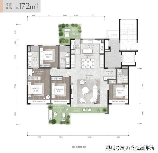 172㎡,四面宽,南北双露台,南向露台进深约3.2米,客厅开间6米。