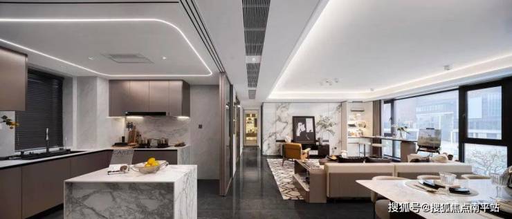 其三,LDKB(顶豪惯用)+X创新设计手法,运用到了极致,客厅、餐厅、厨房、阳台,以及玄关等,能够自由组合成一个“大厅”,满足家庭社交和共享所需。生活动线简单了,走道也几乎零空间浪费。