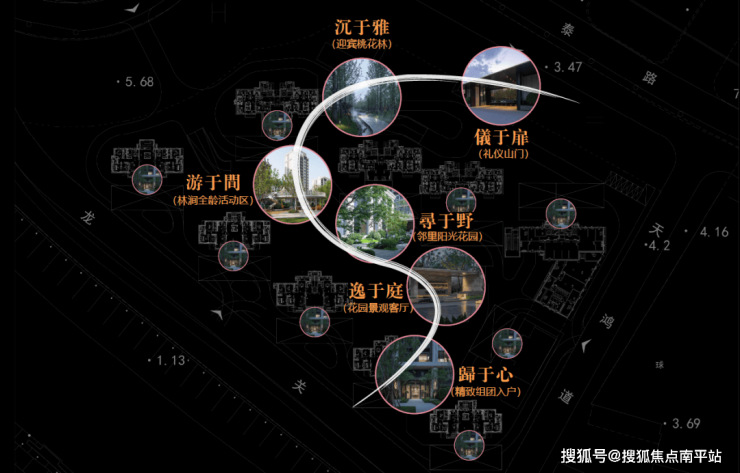 项目借鉴江南园林的造景手法,在北方的土地上,复刻了仇英《桃花源图》里的隐世盛景。设计师从画中提炼出“桃源六境”,让业主从踏入社区的那一刻起,便能开启一场 “复得返自然” 的归家之旅,为日常生活增添了浓浓的人文与自然气息。