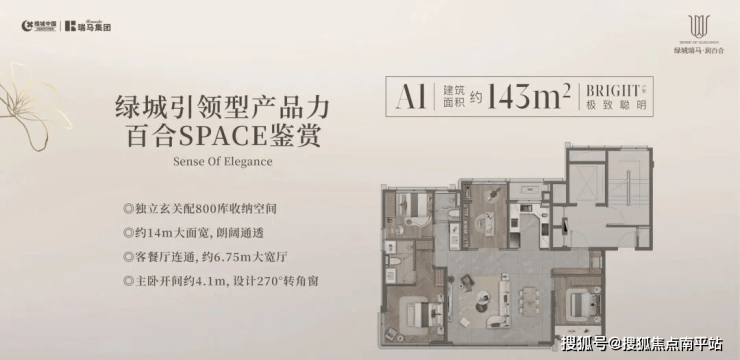 143㎡三/四室:独立玄关+800库收纳空间;约14米面宽;客餐厅连通,约6.75大宽厅;主卧开间约4.1米,带270度拐角落地窗。缺点是有两个北卧。