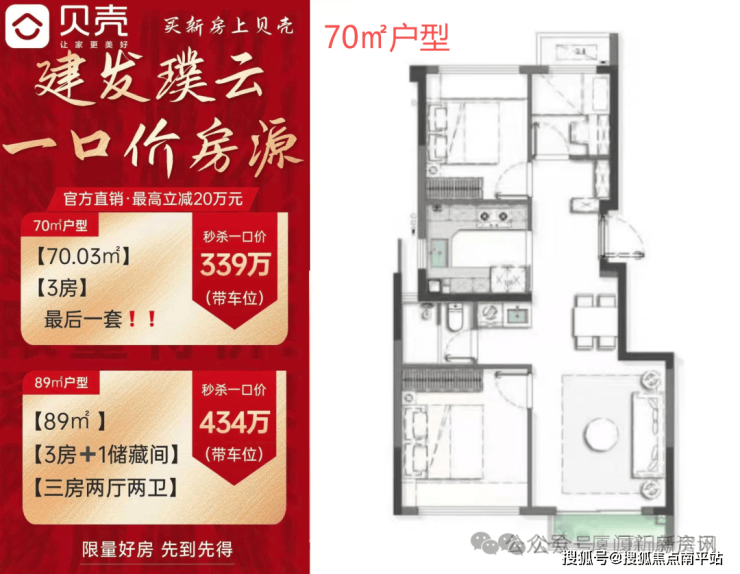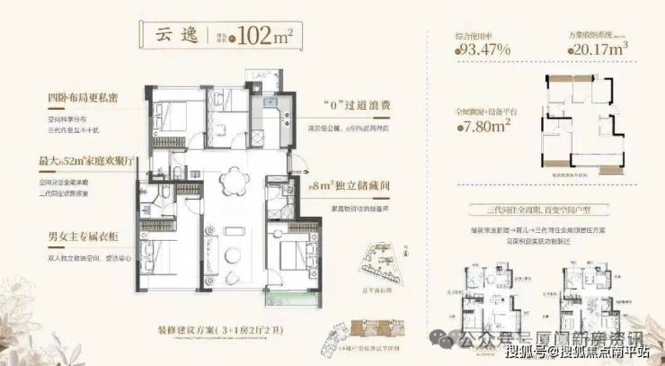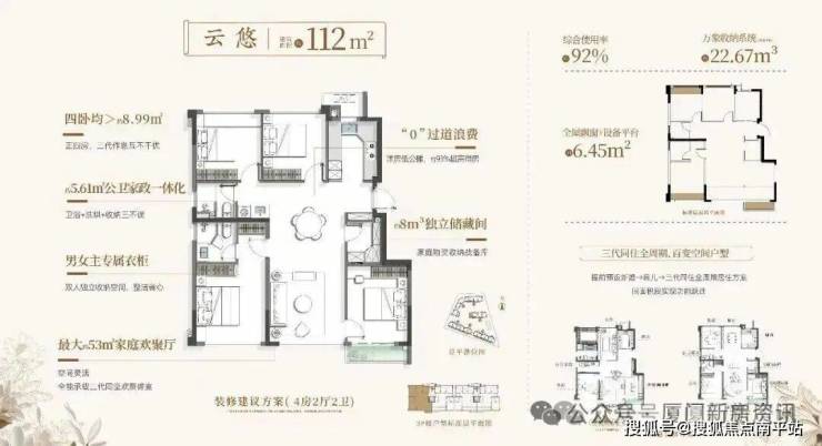 作为一处纯粹洋房社区,建发璞云仅规划6—10层低密建筑,共195套房源。 面积从70㎡延伸至113㎡,均价约4.8万/㎡,部分高性价比楼层更具吸引力。全系一梯两户、南北通透,得房率突破90%,岛内首创的万象收纳系统,结合架空层泛会所与空中花园,重构了小户型的空间想象。