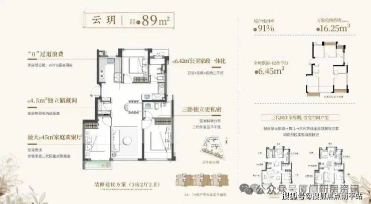 建发璞云主推82-113㎡户型,更有少量70㎡三房,总价三百余万起,为岛内置业打开低门槛窗口。通过全飘窗、设备阳台等巧妙设计,空间使用率大幅提升:89㎡三房两卫得房率约91%,102㎡户型达93.5%,112㎡户型约92%。以89㎡为例,实际使用面积可媲美市面上100-116㎡的高层住宅。