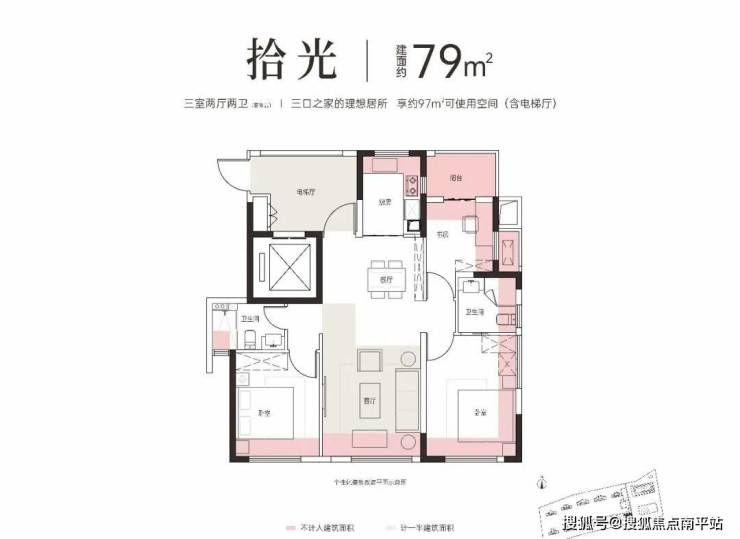 3房2厅2卫设计,还带个小套卧,太少见了,可使用空间(含电梯厅)约97m²,