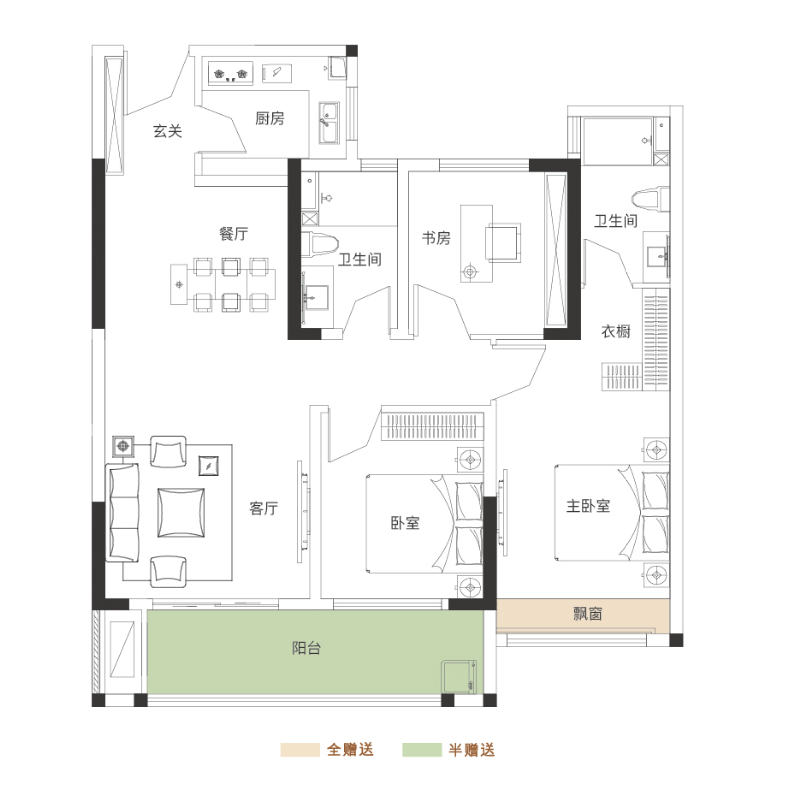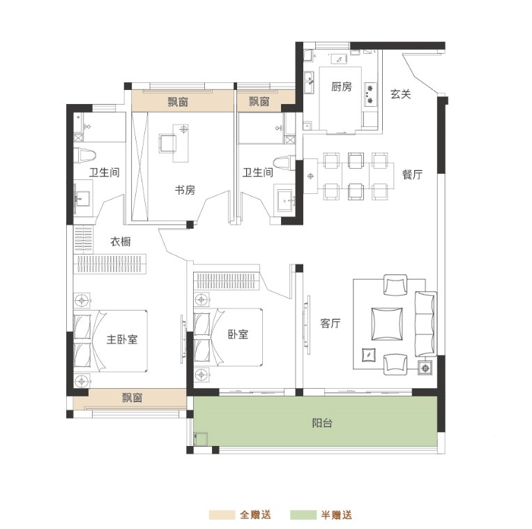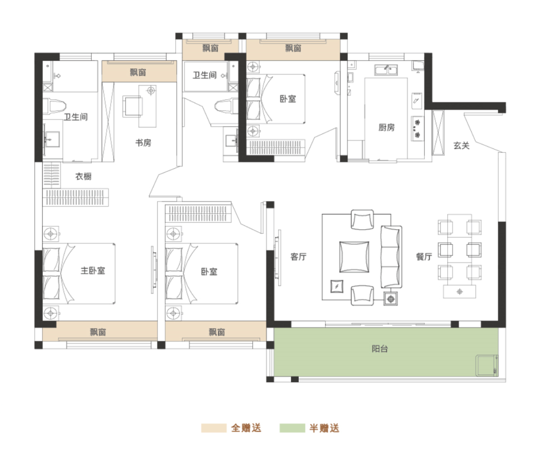爱花草的主人可以在阳台上种植绿色植物,热爱运动的主人可以在阳台上放置跑步机或瑜伽垫,亦或是休闲的茶桌、躺椅等,健身与阅读都可满足。