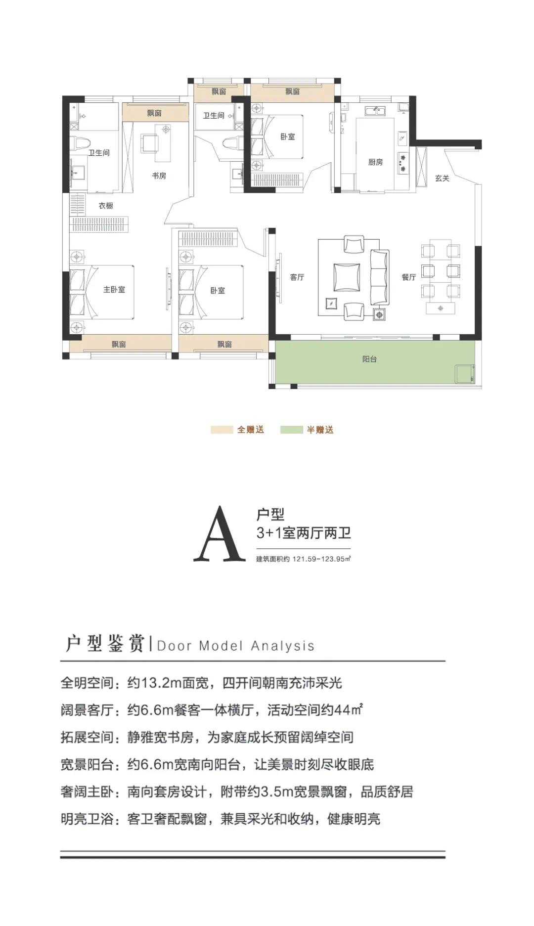 较大约13.8m开间面宽,以四季阳光敬畏一生风光;最宽约6.6 m客厅、最宽约6.9 m南向阳台,搭配方正户型、奢阔尺度、全功能格局,将居住舒适度和生活美学优质融合,从清晨到日暮,清风徐来。